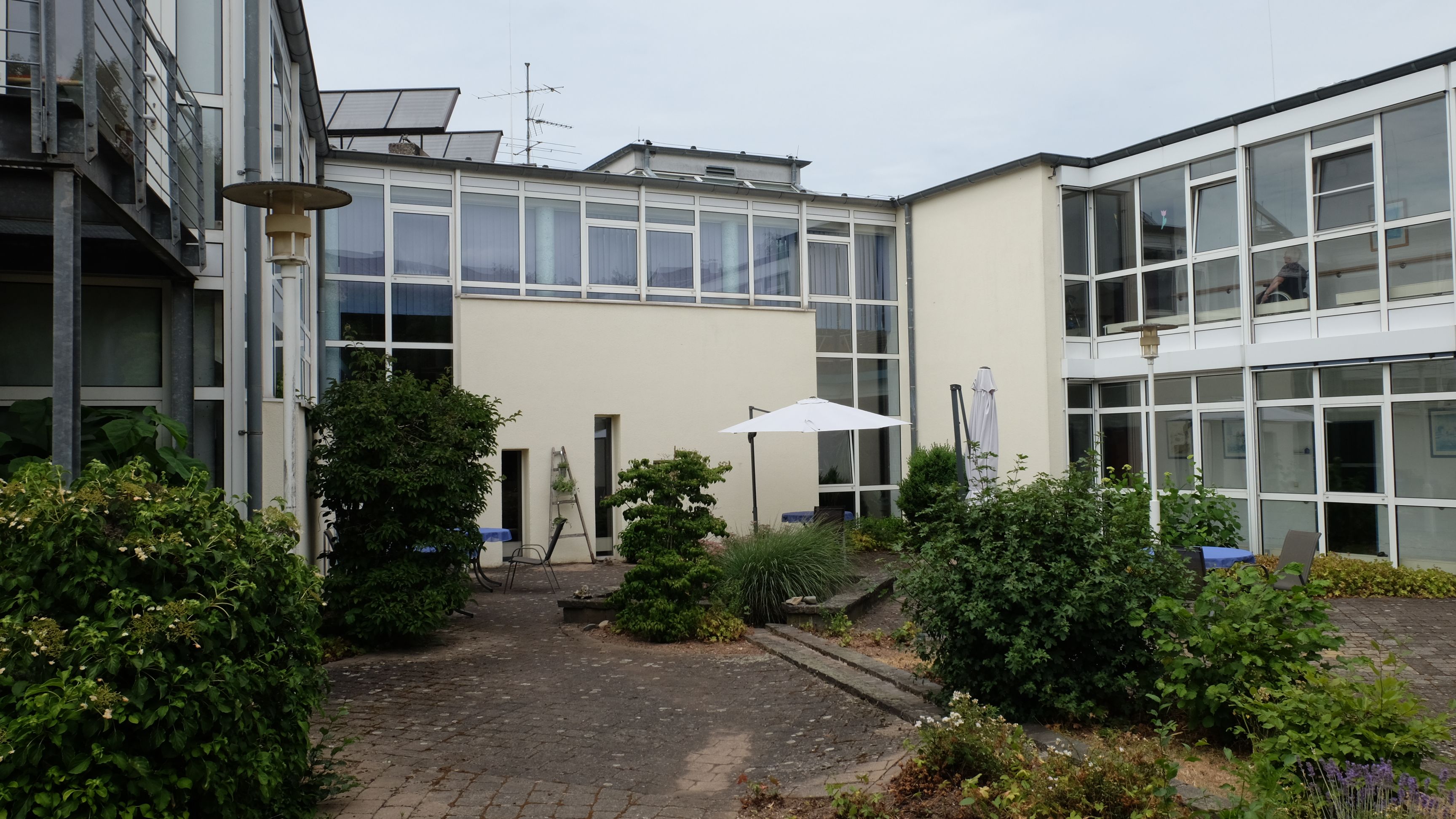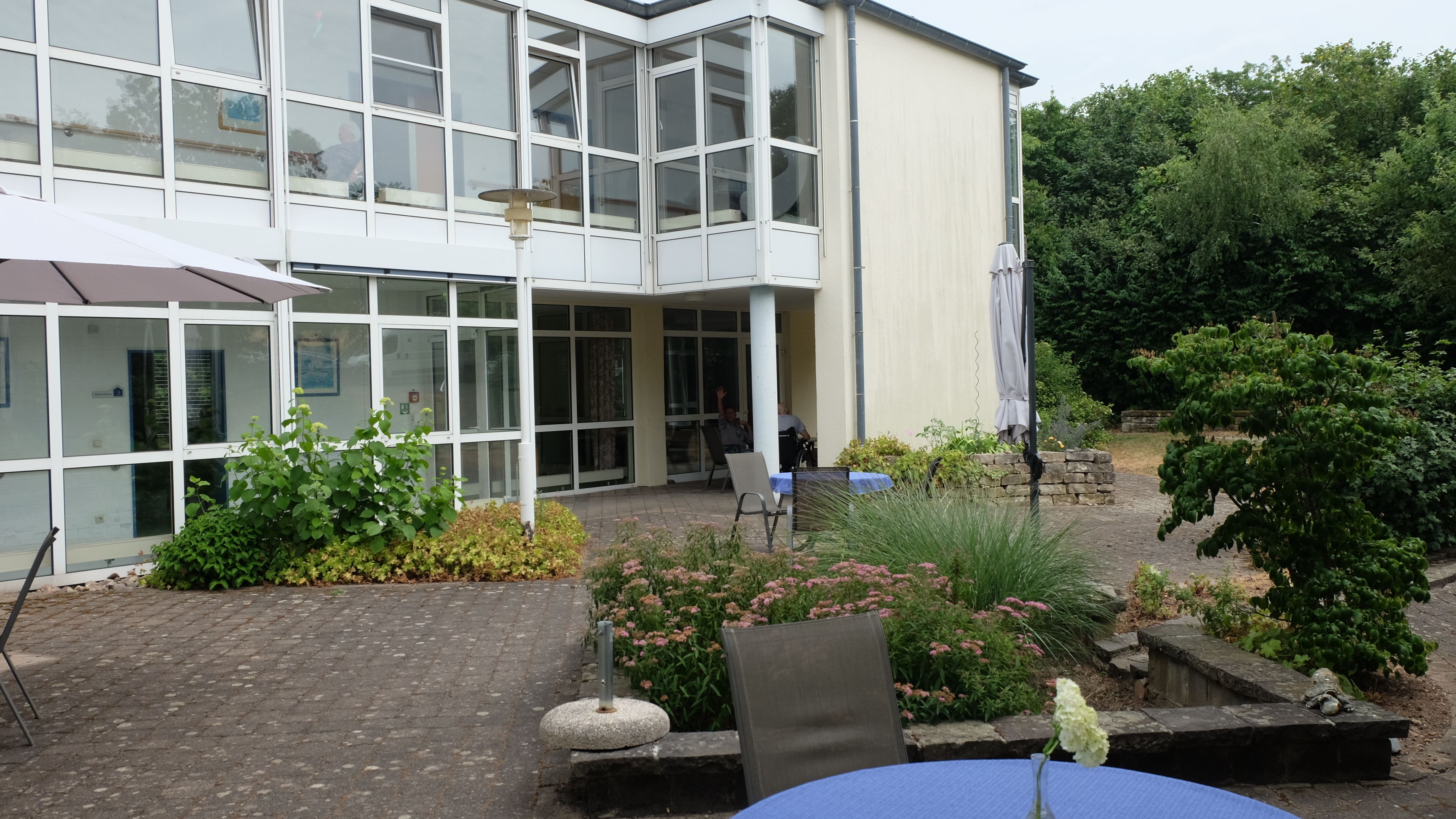 Dem oftmals stark gesteigerten Bewegungsdrang kann über die weitläufigen Flure bis hinaus in den Garten nachgegeben werden. Ein Teil der Terrasse wurde für die Bewohnerinnen und Bewohner zur alleinigen Nutzung abgetrennt. Hier stehen mehrere Hochbeete für die Gartenarbeit zur Verfügung oder bequeme Sitzgelegenheiten laden zum Verweilen ein.