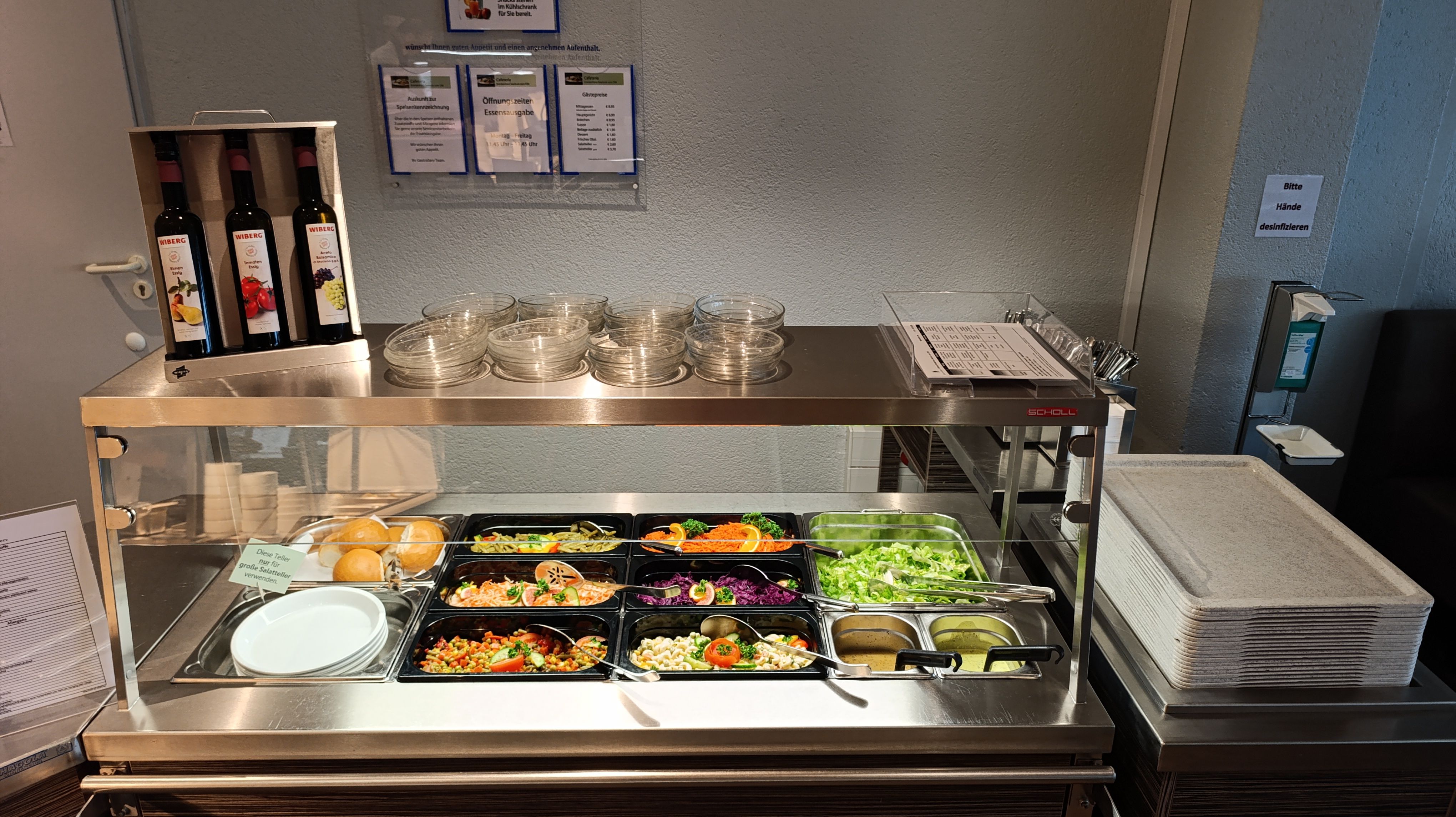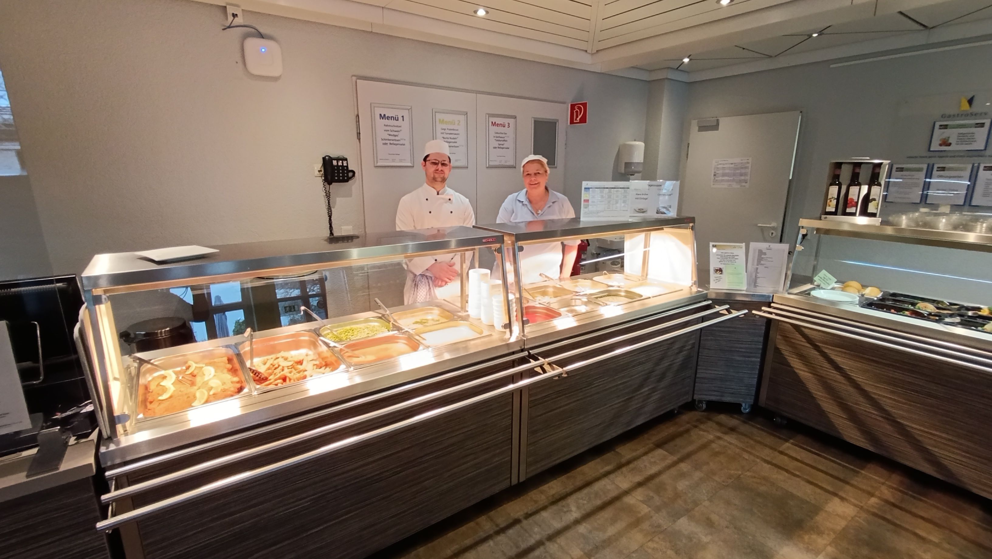 An der Essensausgabe erhalten Sie in der Zeit zwischen 11:45 Uhr und 13:45 Uhr warme Mittagesgerichte in Menüform, mit Suppe, Nachspeise und wahlweise Salatbuffet.